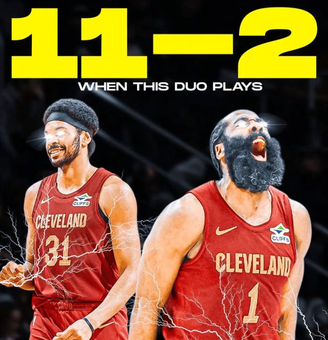 4月10日,美国媒体ClutchPoints晒出一份数据:当哈登和阿伦同时登场时,骑士11胜2负!