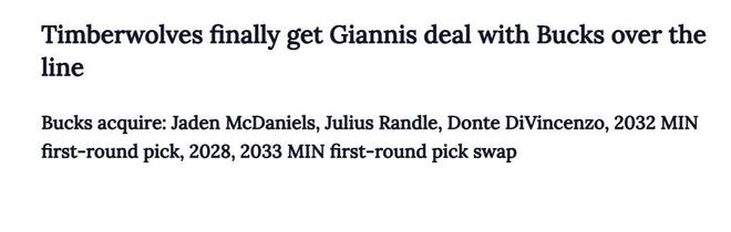 雄鹿得到:麦丹+兰德尔+迪文芩佐+32年首轮+28、33年首轮互换。