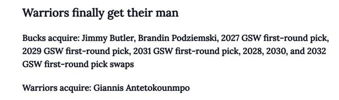 雄鹿得到:巴特勒+波杰+27年勇士首轮+29年勇士首轮+31年勇士首轮+28、30和32年勇士首轮互换;