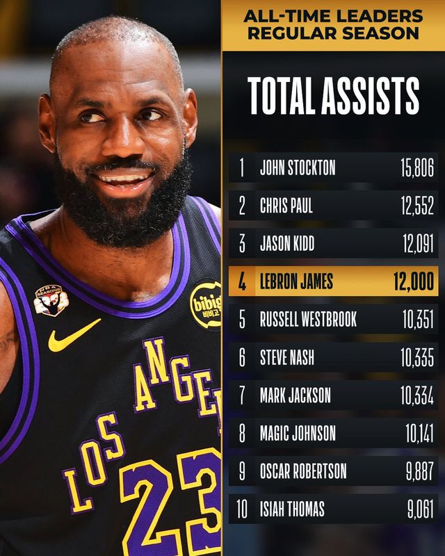 詹姆斯长传助攻艾顿得分,这是詹姆斯本场送出的第2次助攻,也是个人常规赛生涯的第12000次助攻。他成为NBA历史上第4位至少送出12000次助攻的球员,排在历史前3的依次是斯托克顿、保罗和基德。