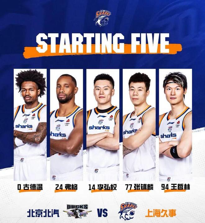 上海男篮今日首发阵容和上轮一致:古德温、弗格、李弘权、张镇麟和王哲林。