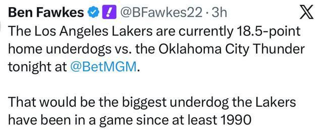 雷霆主场打湖人,盘口直接开到18.5分。这是湖人自1990年以来最大的受让分差,当时那支球队还有魔术师、沃西、斯科特和迪瓦茨。