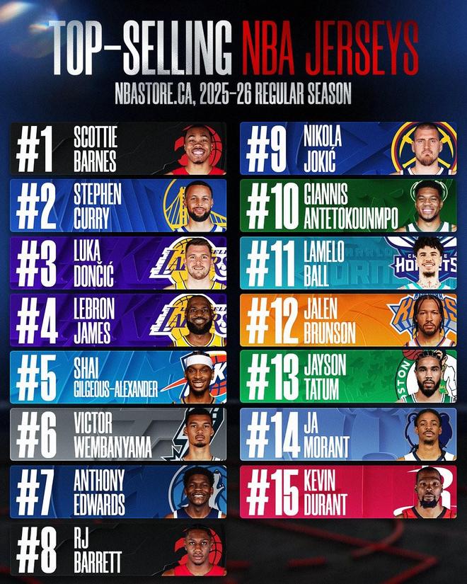 加拿大NBA球衣销量排行:斯科蒂-巴恩斯第一,库里第二
