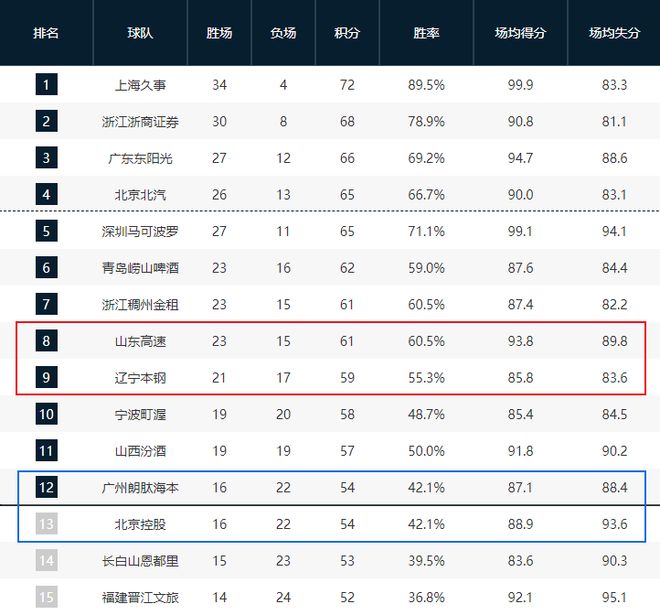 截至目前,山东队以23胜15负的战绩排名第8,仅领先第9名的辽宁队2个胜场,但胜负关系存在劣势。这意味着,如果山东队在常规赛结束后与辽宁队战绩相同,则排名靠后。常规赛还剩4场,面对4个对手中整体实力相对最弱的北控,务必全力争取胜利,守住12进8系列赛的主场优势。