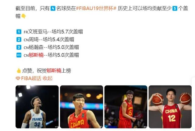 去年U19世界杯曾代表中国男篮出战,场均能够贡献11.3分4.6篮板5盖帽;从这份数据来看,这项赛事至今为止只有四人能交出场均5记盖帽,除了郇斯楠之外,另外三人分别是文班亚马、杨瀚森、周琦,而这三人全都通过选秀顺利进入了NBA。