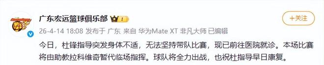 比赛开打前60分钟,广东宏远俱乐部迅速发布官方通报,证实杜锋因急性胃部痉挛被紧急送医,无法参与本场执教任务。