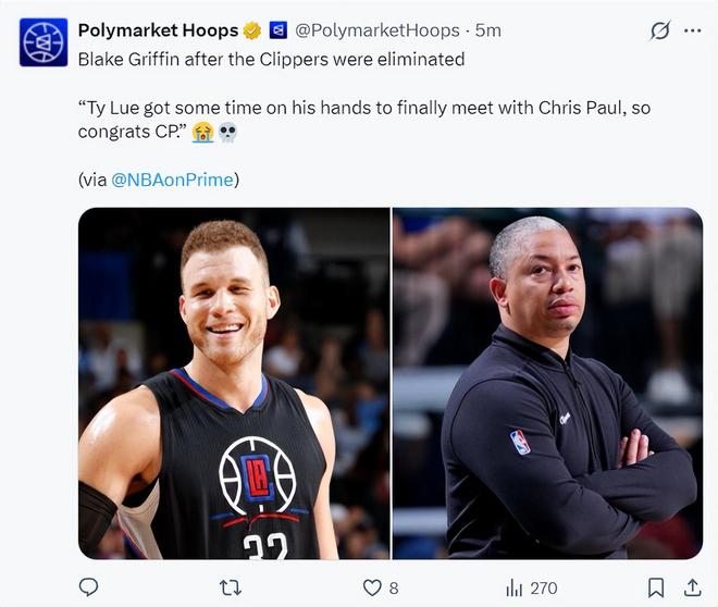 就连快船名宿布雷克-格里芬也开始嘲讽泰伦卢,他在采访中说道:泰伦卢终于有了清闲的时间,他终于可以跟保罗见面了,恭喜保罗!