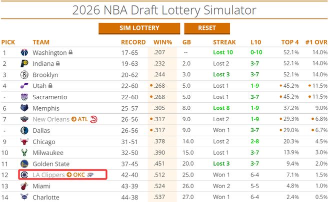 在快船确定无缘季后赛后,雷霆队获得了快船2026年的无保护首轮,那个首轮已经确定是乐透签,目前选秀网站预测是首轮12顺位,本赛季拿下64胜的雷霆又成为超级赢家了。