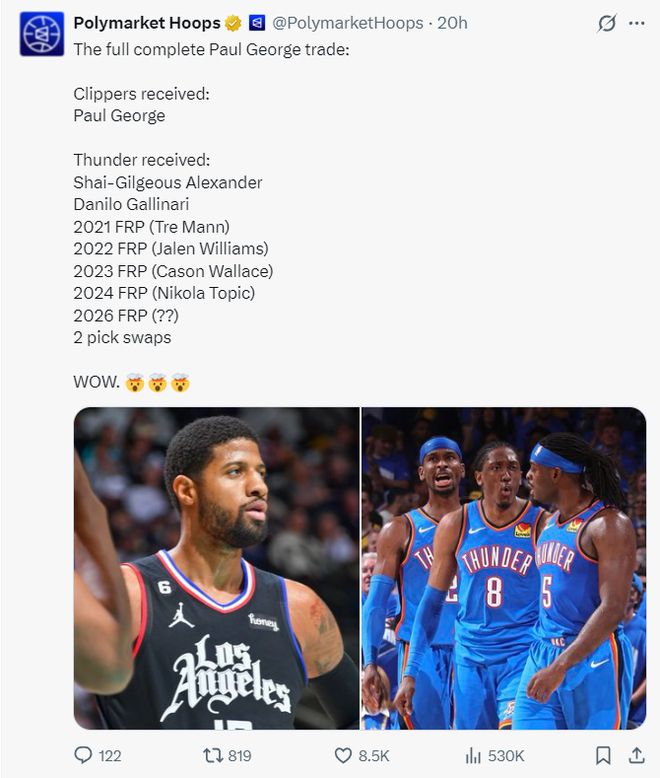 2019年快船为了交易得到保罗-乔治,送出了4个不保护首轮、1个乐透保护首轮、2个首轮互换权。(还有现役联盟前二的超级巨星亚历山大)