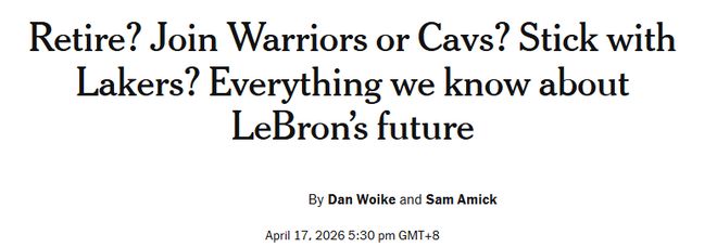 北京时间4月17日,据The Athletic报道,多位获准匿名受访的球队及联盟消息人士透露:詹姆斯目前尚未对未来做出任何决定,退役依然是切实存在的选项。外界普遍认为詹姆斯会开启巡回告别赛季,而消息人士明确辟谣:这种说法并不属实,多名知情者表示,他们甚至直接听詹姆斯本人否定过这一想法。