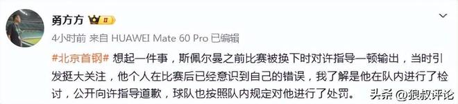 赛前,北京记者勇方方发文,提到了斯佩尔曼和许利民的冲突话题表示:“斯佩尔曼之前比赛被换下时对许指导一顿输出,当时引发挺大关注,他个人在比赛后已经意识到自己的错误,我了解是他在队内进行了检讨,公开向许指导道歉,球队也按照队内规定对他进行了处罚。”