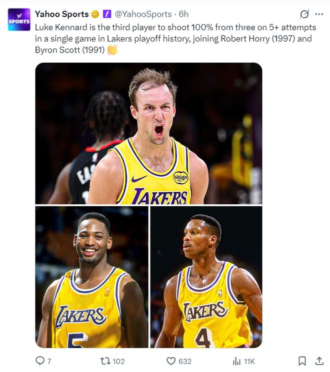 九、肯纳德是湖人队史季后赛第三场出手5次且全部命中的球员,比肩97霍里与91年斯科特;