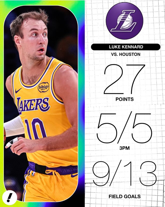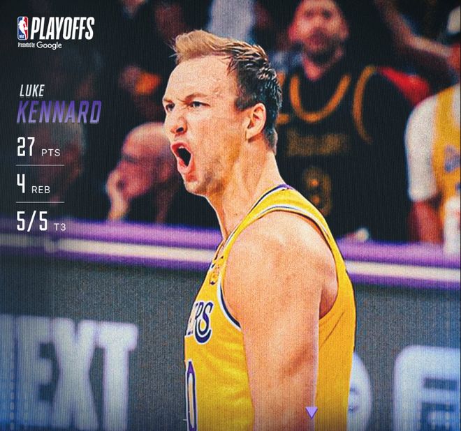 湖人的首轮G1卢克-肯纳德发挥亮眼,他赛后被誉为‘卢克魔法’。相信大家都知道东契奇有个绰号是‘卢卡魔法’,如今东契奇在场下挥毛巾看着另一个魔法师发挥。肯纳德此役38分钟,13中9,三分5中5,罚球6中4,拿到27分4篮板3助攻,命中率69.2%,三分命中率100%,真实命中率86.3%。