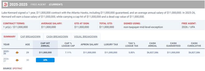肯纳德本赛季的薪水只有1100万,他过去三年都是联盟三分最准的球员,他能来湖人都要感谢佩林卡的运作。