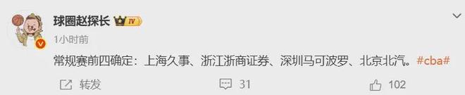 特别值得一提的是,已经确定广东队无缘本赛季常规赛前四。前四球队分别是上海队、广厦队、深圳队和北京队。