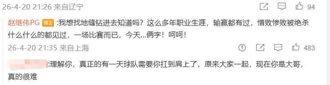随后继伟还在评论区留言:我想找地缝钻进去知道吗?这么多年职业生涯,输赢都有过,惜败惨败被绝杀什么什么的都见过,一场比赛而已,今天…俩字!呵呵!继伟今日如此反常,十分罕见,不知道是不满队友表现还是不满裁判吹罚他技犯?