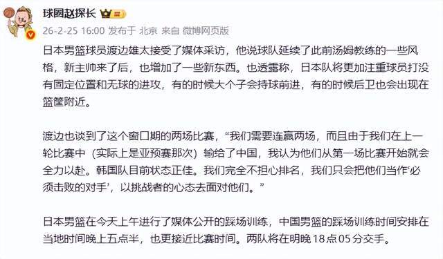 北京时间2月26日18:05,中日男篮将在世界杯预选赛窗口期迎来直接对话。赛前,日本队核心球员渡边雄太在接受媒体采访时,释放出强烈战意——“我们不关心排名,只把中国和韩国当作必须击败的对手。”