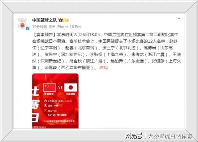 北京时间2月26日,中国男篮对阵日本男篮的12人终极大名单火热出炉,具体如下: