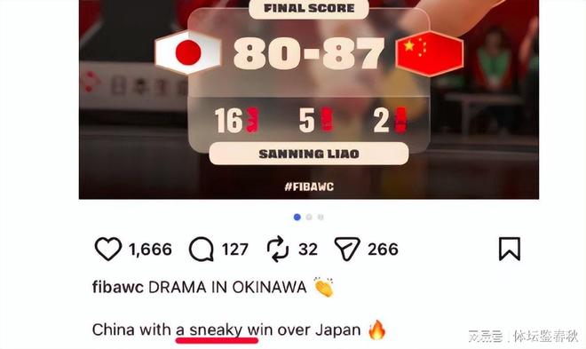 而就在今天凌晨,国际篮联官网在战报中用中国队“从日本偷走一场胜利”来形容这场比赛的结果。这一表述引发了球迷的极大愤慨。中国队是在客场完成翻盘,用“偷”来形容显得格外刺耳。国外论坛同样有声音质疑这一措辞是否失当。几个小时后,国际篮联官网将这段文字改为“下半场完成逆转并带走胜利”。