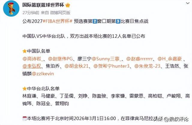 中国男篮官宣对阵台北阵容名单,张镇麟引发争议,三名裁判确定!
