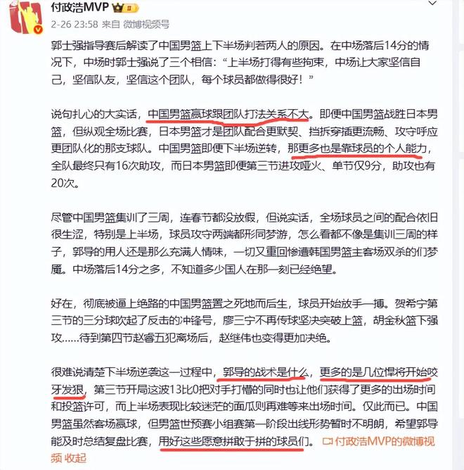 赛后,名记付政浩发表了多篇评论,有赞扬队员表现神勇的点评,有肯定贺希宁几个球员敢打敢拼的点评。但他也敢说真话,寻找胜利中的存在问题和不足。不得不说付政浩敢于说真话,他公开说中国男篮赢球跟团队打法关系不大,与郭士强战术无关,即便是下半场也看不到郭士强战术,全是依靠球员的个人能力实现了逆转,是依靠贺希宁和赵继伟的三分球打开了活路。