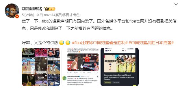 只是根据媒体人报道:“fiba的道歉声明只有国内发了。国外各媒体平台和fiba官网并没有看到相关信息,只是修改和删除了一下之前措辞有问题的信息。好嘛,又是个特供版。”