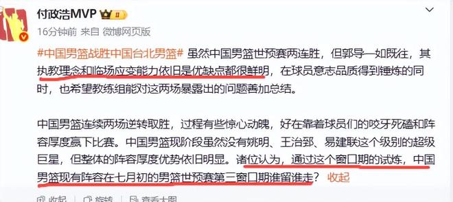 赛后名记付政浩对比赛有些不满,他表示,“虽然中国男篮世预赛两连胜,但郭导一如既往,其执教理念和临场应变能力依旧是优缺点都很鲜明,在球员意志品质得到锤炼的同时,也希望教练组能对这两场暴露出的问题善加总结。”他还说,通过这个窗口期的试炼,中国男篮现有阵容在七月初的男篮世预赛第三窗口期谁留谁走?