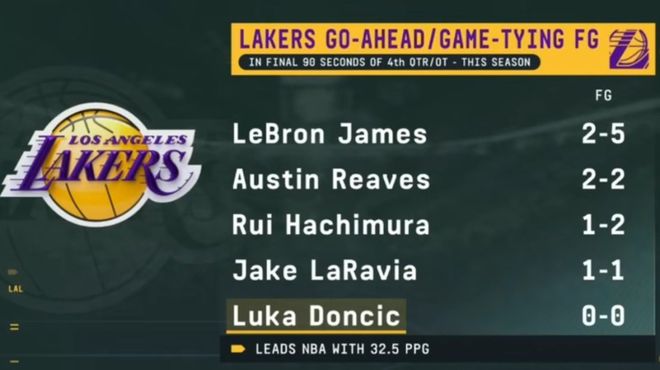首先,本赛季第四节或加时最后90秒的扳平或反超球方面,身为NBA的得分王(场均32.5分)却没有一次出手。数据显示,湖人其他球员在这个情况下的出手数据如下:詹姆斯5中2,里夫斯2中2,八村垒2中1,拉拉维亚1中1,但东契奇是0中0。