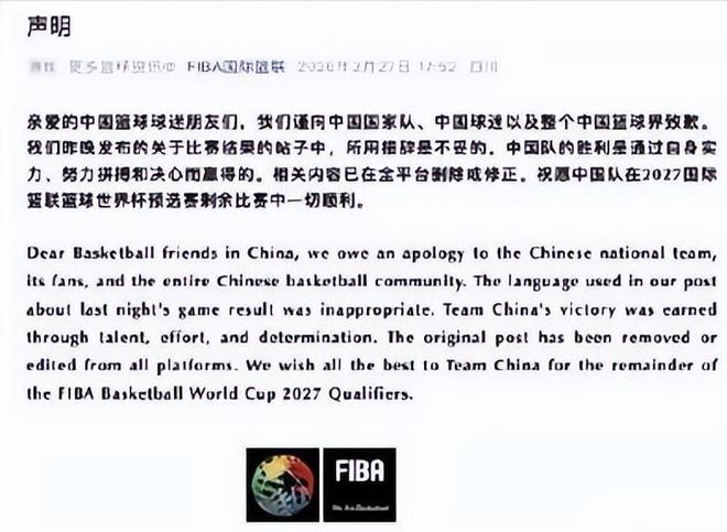 迫于汹涌舆情,国际篮联于当晚悄悄将原文中“sneaky”替换为中性词“narrow”,但未配发任何说明。这种回避式处理非但未能平息众怒,反而加剧公众对其公信力的质疑。2月27日清晨,国际篮联火速发布中英文双语致歉声明。