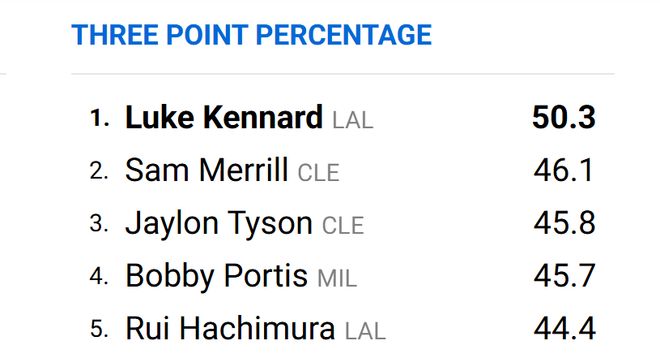 北京时间3月8日,卢克-肯纳德是洛杉矶湖人队一笔极佳的引援,他成为了球队交易截止日前一直缺少的高效替补得分点。近年来,大多数顶级射手在洛杉矶的聚光灯下都表现挣扎,但肯纳德并未出现这种情况。赛季至今,肯纳德的三分命中率高达50.3%,在所有符合NBA数据排名的166名球员中高居第一,目前为湖人出战的13场比赛,三分命中率更是高达52.5%!