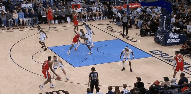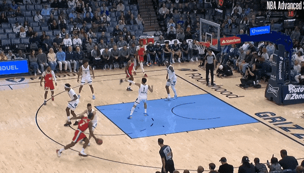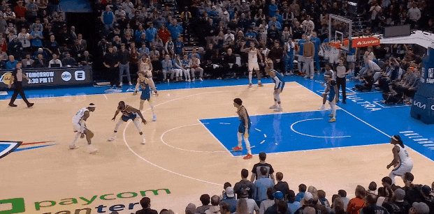 ——堵中放边进入罚球线以下,三人合围,知道亚历山大必须回球弧顶、快传弱侧,于是X字轮转。