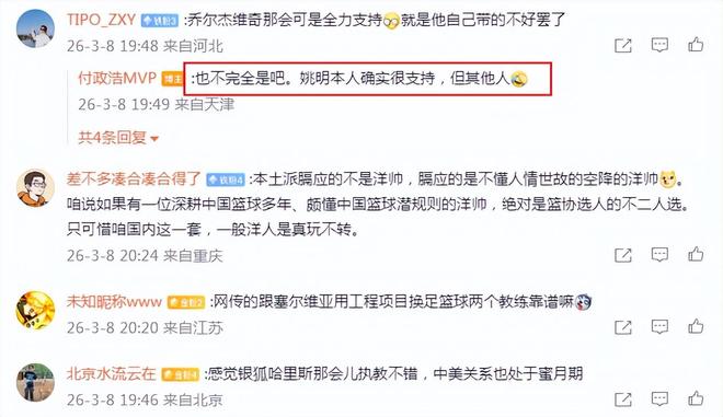 付政浩回复道:“也不完全是吧。姚明本人确实很支持,但其他人(悲允表情)。”