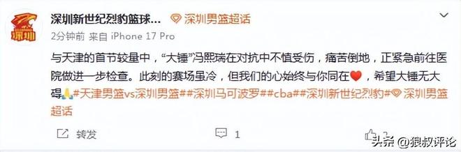 不久前,深圳男篮官方发文:与天津的首节较量中,“大锤”冯熙瑞在对抗中不慎受伤,痛苦倒地,正紧急前往医院做进一步检查。此刻的赛场虽冷,但我们的心始终与你同在[心],希望大锤无大碍。