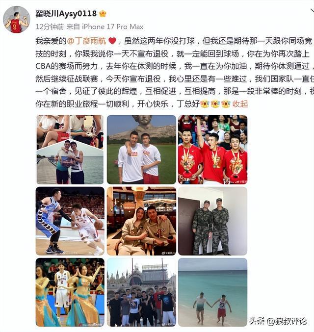 北京男篮球员翟晓川发文评论说道:我亲爱的丁彦雨航 ❤️,虽然这两年你没打球,但我还是期待那一天跟你同场竞技的时刻,你跟我说你一天不宣布退役,就一定能回到球场,你在为你再次踏上CBA的赛场而努力,去年你在体测的时候,我一直在为你加油,期待你体测通过,然后继续征战联赛,今天你宣布退役,我心里还是有一些难过,我们国家队一直住一个宿舍,见证了彼此的辉煌,互相促进,互相提高,那是一段非常棒的时刻,祝你在新的职业旅程一切顺利,开心快乐,丁总好。
