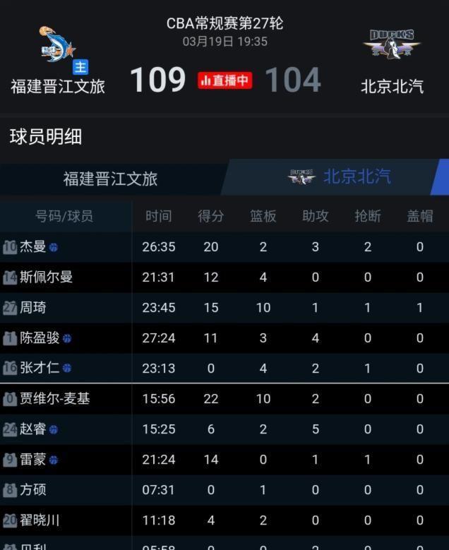 原本外界一致认为,北京北汽手握周琦、麦基、赵睿等国字号主力与顶级外援组成的豪华班底,又携四连胜的高昂士气,客场挑战联赛中下游的福建晋江文旅,无异于一场“降维打击”,轻松赢下即可锁定前四席位,稳稳夯实争冠梯队基础。
