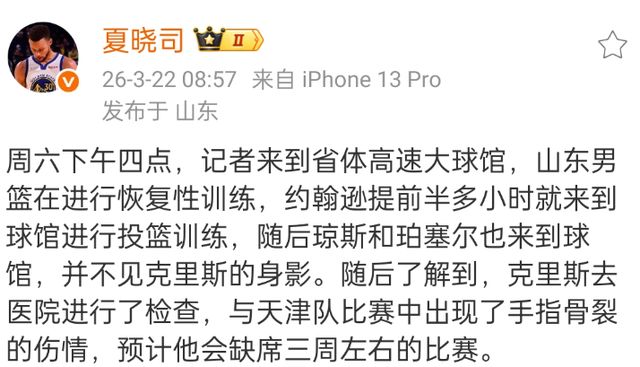 第二阶段开始后,山东男篮表现不是很理想,一方面是新外援磨合的不好,还有就是出现了一些伤病情况,根据山东媒体报道,山东男篮大将克里斯出现了手指骨裂的情况,需要休息至少三周,这对于山东男篮打击不小。