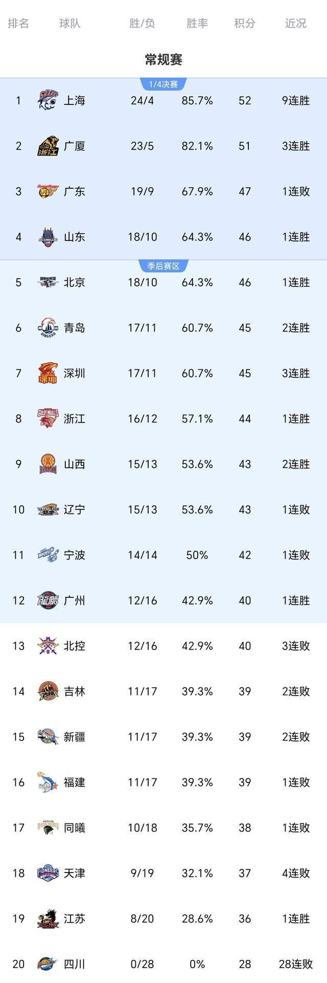 CBA狂欢夜!上海赢40分,北京逆转辽宁,最新排名乱了:榜首易主