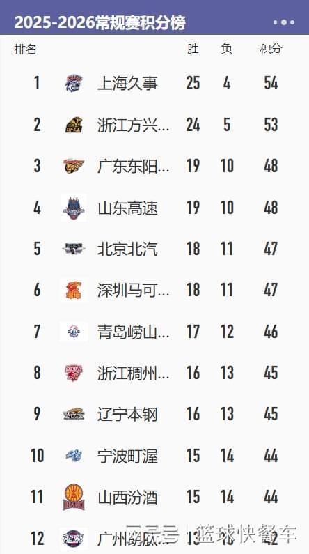 CBA积分榜最新排名出炉!上海冲上第1辽宁第9:广东恐跌出前四?