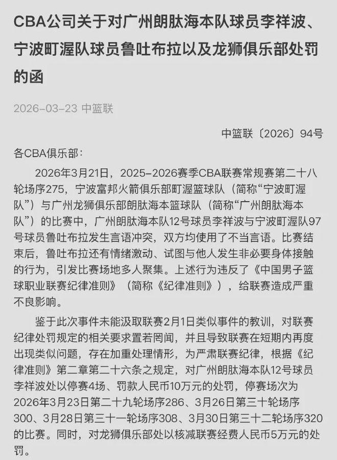 CBA官方宣布:李祥波停赛4场+罚款10万,鲁吐布拉停赛1场+罚款5万。