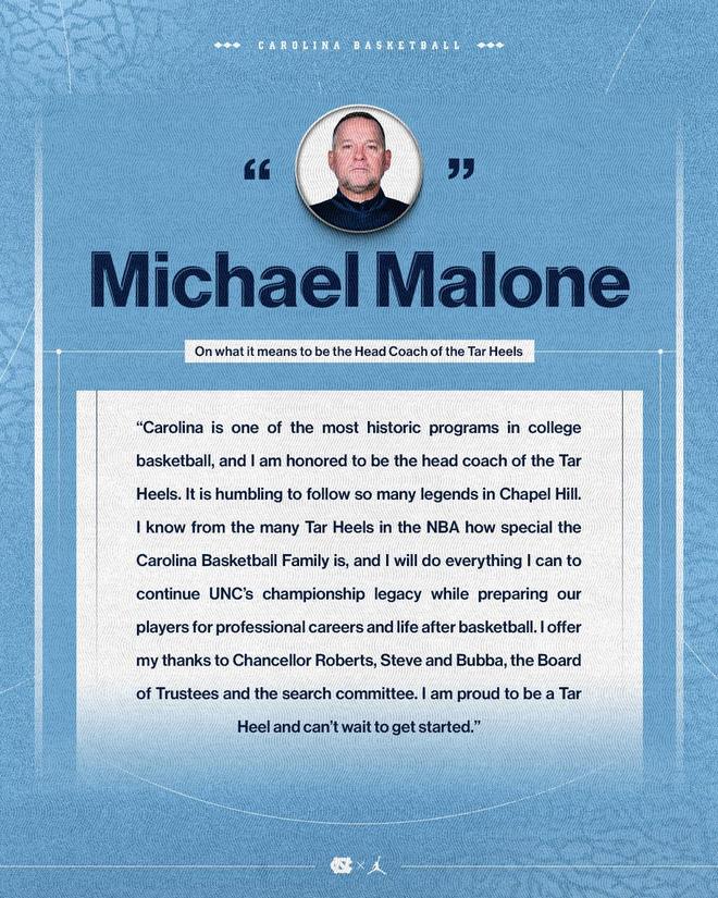 在加入北卡大学后,马龙也发表了声明:“北卡是一座历史悠久的篮球名校,能够成为这支球队的主教练我感到十分荣幸。我将谦逊地在教堂山追随众多传奇人物的脚步。我知晓北卡在NBA当中的影响力,也知道这支球队的独到之处。我会尽我所能帮助球队,延续球队的冠军传统,帮助大学球员为职业生涯做好准备。”