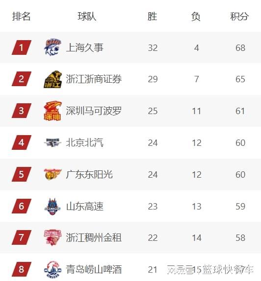 11冠王广东队,他们的战绩和北京队一样,也是24胜12负,排在积分榜第5名。而积分榜第6名则属于山东队,他们的战绩为23胜13负,目前这四支球队将争夺剩下的两个四强席位。从各支球队的状态以及剩下的赛程上来看,深圳队拿到第三名的概率最大,北京队和广东队,他们大概率会争夺剩下的一个四强席位。山东队由于赛程较为艰辛,大概率只能争夺第6名了。