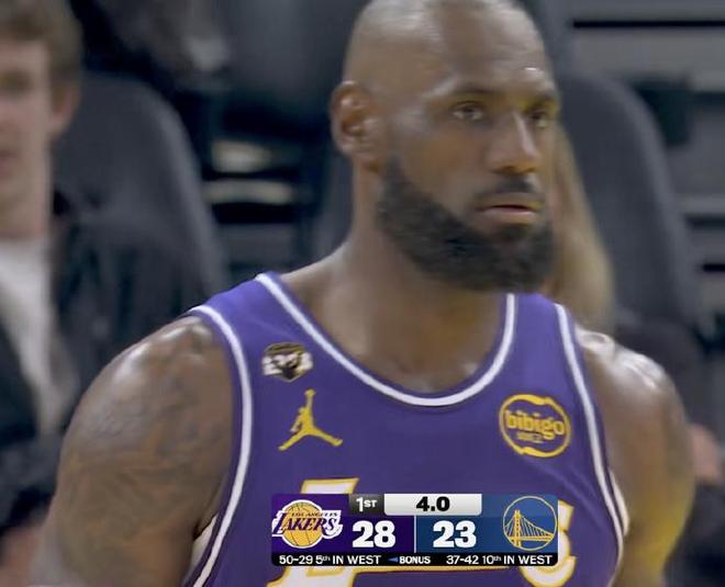 詹姆斯在首节表现出色,他登场8分46秒7中5高效表现,其中三分2中2,一度接到布朗尼长传,完成快攻反击暴扣引发观众呐喊,也是NBA历史首次儿子助攻父亲。詹姆斯首节轰下12分两队唯一得分上双,引领湖人首节28-23领先勇士,但詹姆斯一度踢中追梦裆部导致后者略有不适。