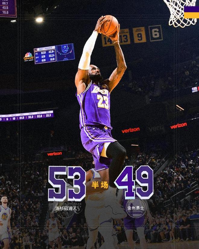 湖人第二节遭遇勇士顽强追分,詹姆斯单节4中2再中一记三分,他上半场11中7,其中三分4中3与罚球2中1,得到18分3篮板2助攻,成为湖人唯一得分上双的球员。至于艾顿9分与八村垒8分,反观勇士最高分是波杰姆斯基12中5得到10分,湖人上半场结束仅53-49领先勇士。