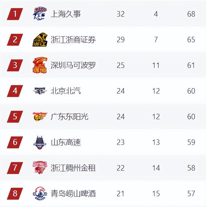 浙江6连胜继续稳居第7,青岛继续第8,浙江和青岛已经提前锁定了季后赛席位,辽宁、宁波、山西将继续竞争一个前八名额,北控、吉林、广州、福建、同曦5队将竞争最后一张季后赛门票(阿不都赛季报销,新疆目前应该没什么希望了)。