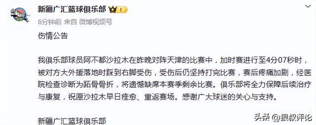 北京时间4月9日,根据新疆男篮官方社媒透露,核心球阿不都沙拉木跖骨骨折,将遗憾缺席本赛季剩余比赛。