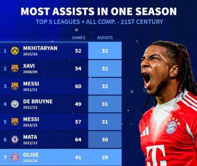拜仁在欧冠客场2比1击败皇马,奥利塞送出助攻。《转会市场》统计显示他已经跻身新世纪五大联赛球员单赛季各项赛事助攻榜第7位。德转列新世纪五大联赛球员单赛季各项赛事助攻榜: