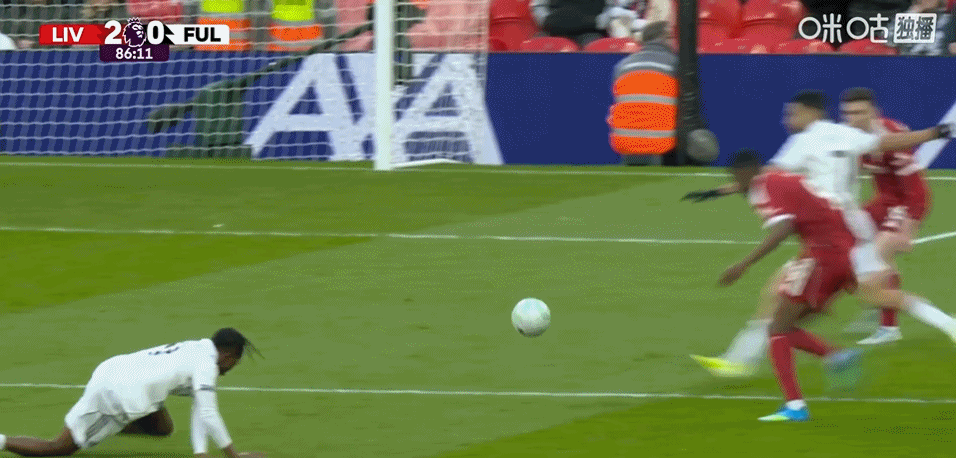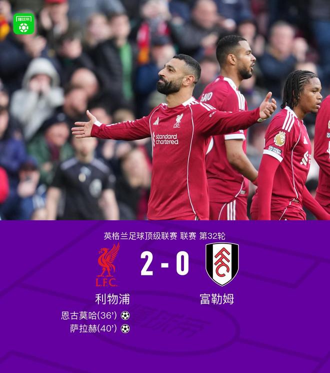 北京时间4月12日00:30,英超第32轮,利物浦主场对阵富勒姆。上半场,罗伯逊低射被封堵,加克波抽射打偏,哈里-威尔逊禁区内兜射打高,恩古莫哈兜射破门,他也成为队史英超打入2球最年轻的球员;随后加克波助攻萨拉赫扩大比分。下半场,加克波禁区内打门被挡出,麦卡利斯特爆射打偏,最终,利物浦2-0富勒姆。