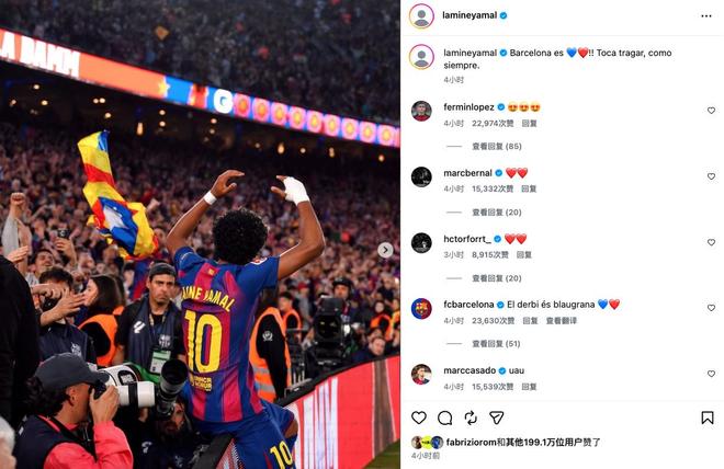 这条动态发布不到半小时,点赞数就已超过60万,评论数达到1万条。其中,巴萨官方账号留言表示:“德比属于红蓝军团。”他的队友加维也评论道:“永远都是这样,兄弟。”