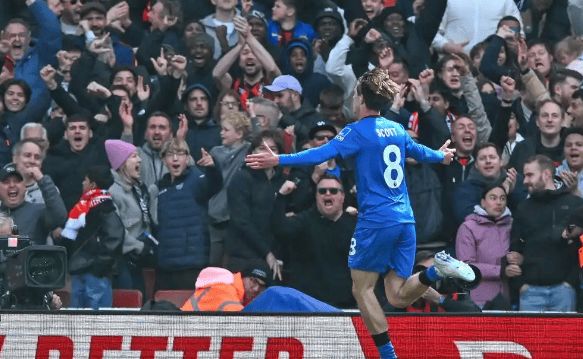 结果第 74 分钟直接被打穿:伯恩茅斯右路斜塞过来,埃瓦尼尔森身体都歪了还能把球垫到中路,斯科特从阿森纳中路的空当里直接蹚进去,大力抽射破门。这球要是有个后卫贴上去,根本传不到他脚下,可阿森纳整条防线跟集体断电似的,眼睁睁看着球进网。