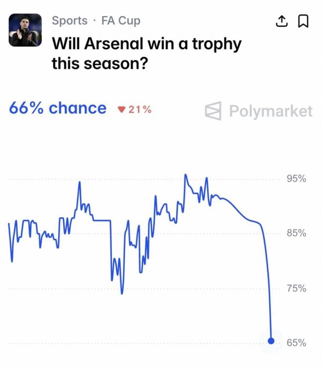 而阿森纳欧冠夺冠概率为26%,本赛季至少1冠的概率也从96%跌至65%。也就是说,曾有望4冠王的阿森纳,现在竟然有接近4成的可能赛季0冠。